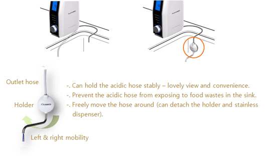 Change electrode polarity to opposite direction every time after use, thereby preventing the plating(coating) phenomenon at electrolytic cell in advance(alkaline water comes out upper dispenser always by use of flow direction auto-change system if electrode polarity changed).